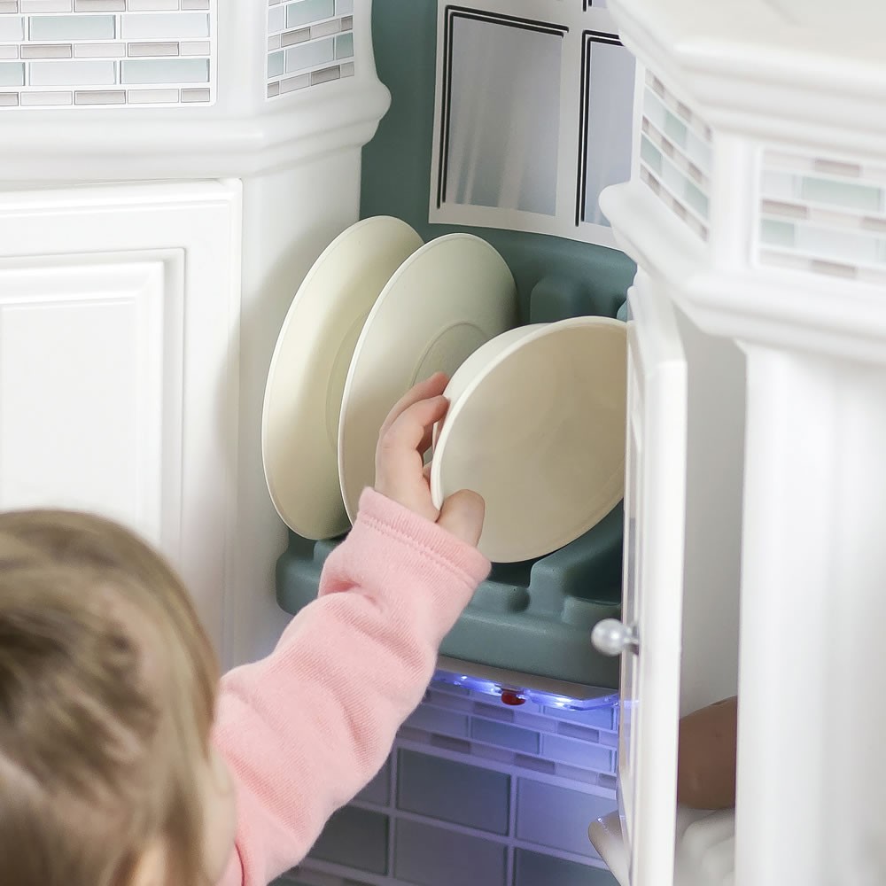 • Ventana enmarcada con luz superior que funciona y repisa para platos alentará a los niños a pretender que lavan los platos y comida de juguete.